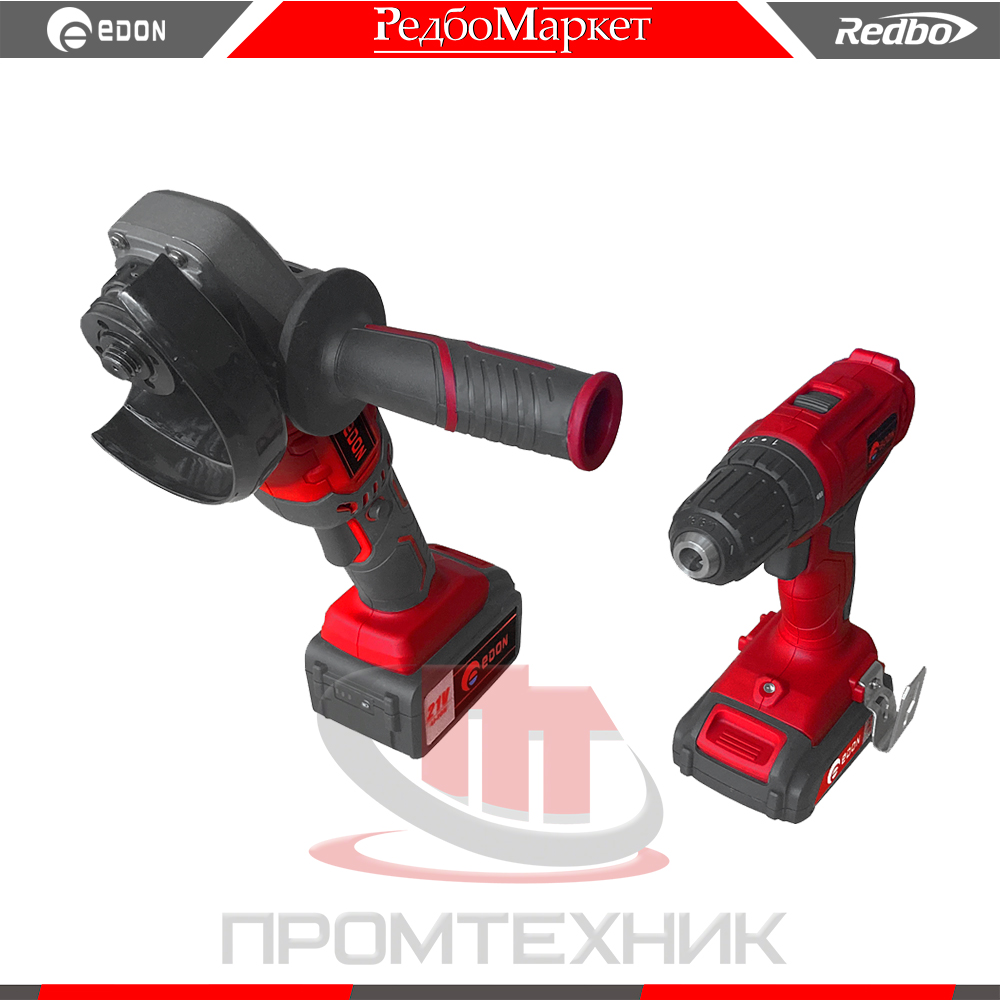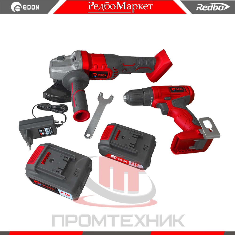 В состав набора входит "болгарка" Edon OAF21-AG, шуруповерт Edon OAF21-AD и два универсальных аккумулятора различной емкости.