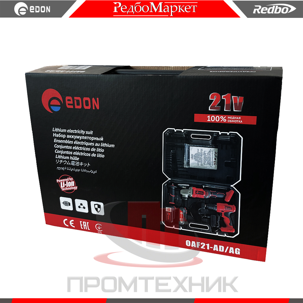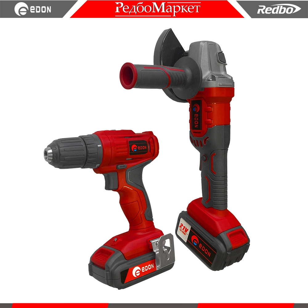В состав набора входит "болгарка" Edon OAF21-AG, шуруповерт Edon OAF21-AD и два универсальных аккумулятора различной емкости.